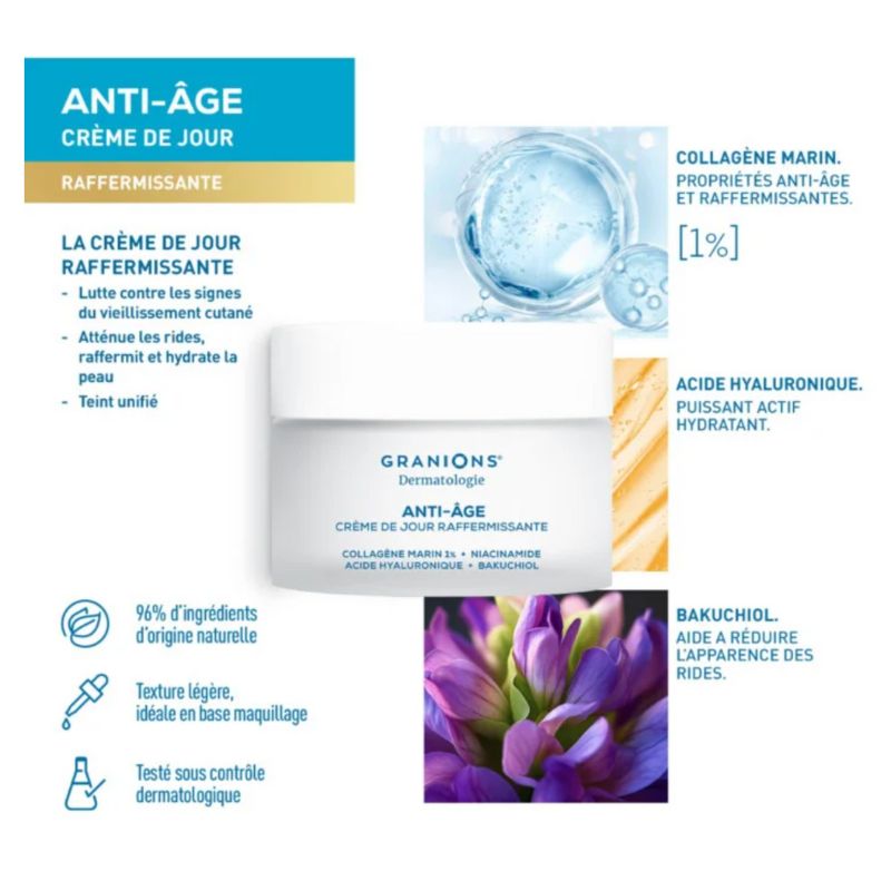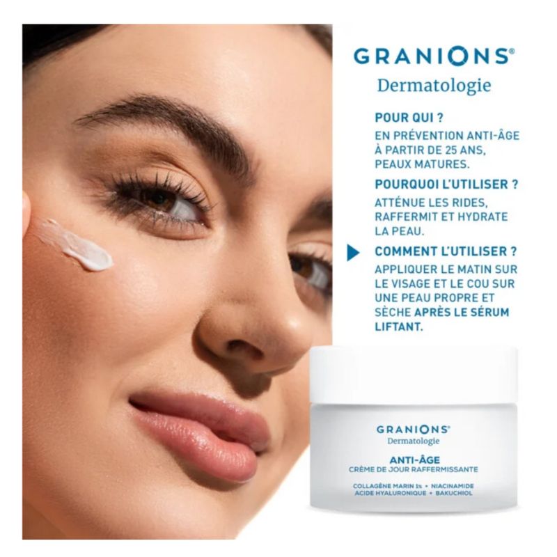 Appliquer chaque matin sur le visage et le cou, sur une peau propre et sèche, de préférence après le sérum liftant de la gamme GRANIONS. Effectuer des mouvements circulaires jusqu’à absorption complète.